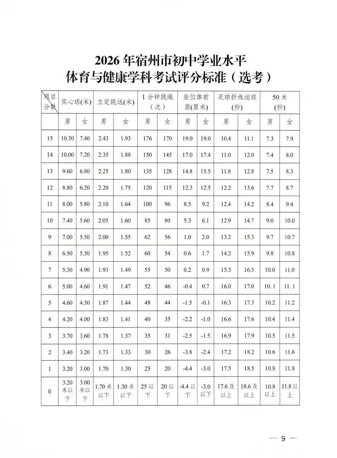 依据《国家学生体质健康标准(2014 年修订)》、教育部《学生足球运动技能等级评定标准(试行)》及教育部、国家体育总局 2007 年颁布的《国家学生体质健康标准》中初中三年级相关项目评分标准等制定的《2026 年宿州市初中学业水平体育与健康学科考试评分标准》(附件 1)。