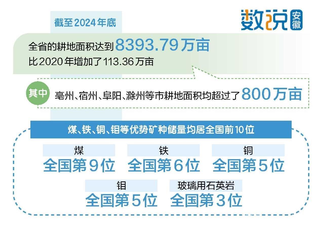 深入开展调查监测,自然资源家底更清。“十四五”期间,我省持续开展了土地、矿产、森林等自然资源的调查监测,动态掌握了各类资源的状况。截至2024年底,全省的耕地面积达到8393.79万亩,比2020年增加了113.36万亩,其中,亳州、宿州、阜阳、滁州等市耕地面积均超过了800万亩。煤、铁、铜、钼等优势矿种储量均居全国前10位,其中煤全国第9位、铁全国第6位、铜全国第5位、钼全国第5位、玻璃用石英岩全国第3位。全省林地、草地、湿地面积分别达到6037.52万亩、85.37万亩、57.80万亩。