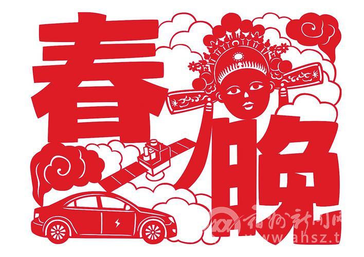 这次亮相的两幅作品,一幅以“灿烂”为主题,回应新年语境中的文化表达;另一幅则围绕“春晚”展开。“春晚”两个字并未被简单剪出,而是被当作画面的结构框架,在字形内部嵌入多个合肥元素:黄梅戏《女驸马》的形象、量子科技的象征符号、新能源汽车的轮廓线条,被有意识地安排在不同区域。