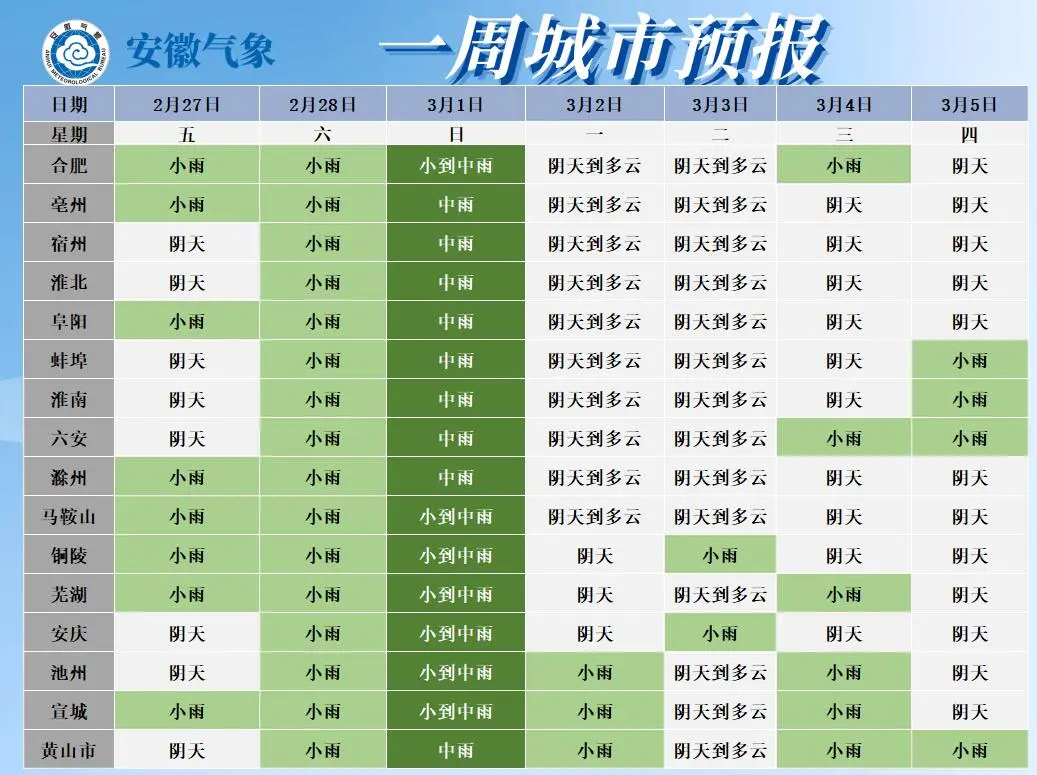 降水预报:3月1日前(正月十三)我省以阴雨天气为主,其中3月1日全省有小到中雨。3月2日(正月十四)至6日沿淮淮河以南部分地区仍有小雨。7-8日全省以多云天气为主。