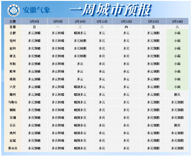 15日(周日):全省阴天,淮河以南部分地区有小雨。