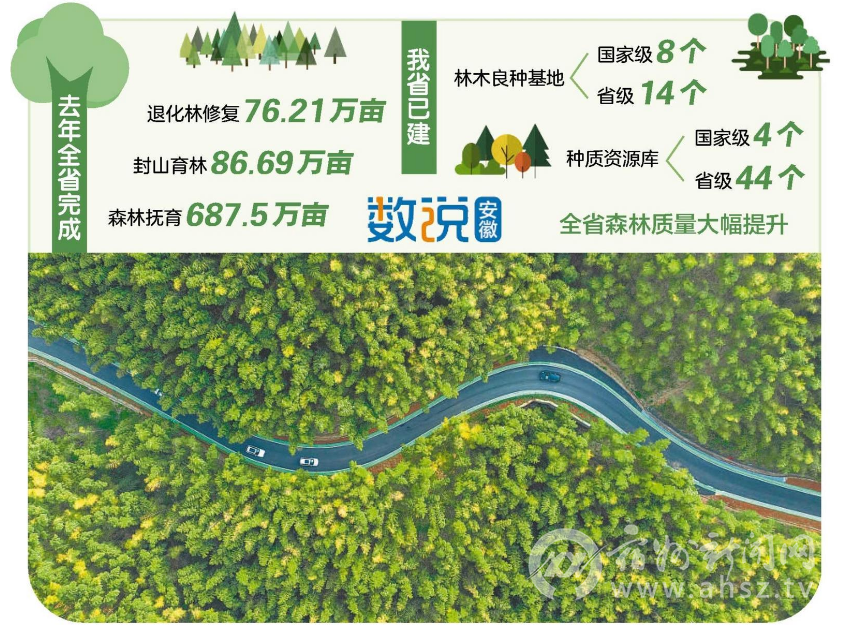 另外,我省还开展彩色森林行动,建成黄山市歙县新安江山水画廊、宣城市泾县六道弯“皖南川藏线”、池州市石台县秋浦河“绿野仙踪”等一批彩色森林带(片)。积极推进全生命周期森林可持续经营,实施省级森林质量提升项目82个,系统推进林相改造和树种结构调整。有序推进国家储备林建设,创新“国储林+林下经济”“国储林+碳汇”等经营模式。加强良种壮苗培育,已建林木良种基地国家级8个、省级14个,种质资源库国家级4个、省级44个。全省森林质量大幅提升,“十四五”期间乔木林单位面积蓄积量增长率达8.85%。