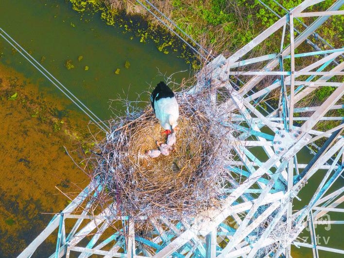 4月1日,池州境内的东方白鹳在高压线塔筑巢,小鸟已经出壳。