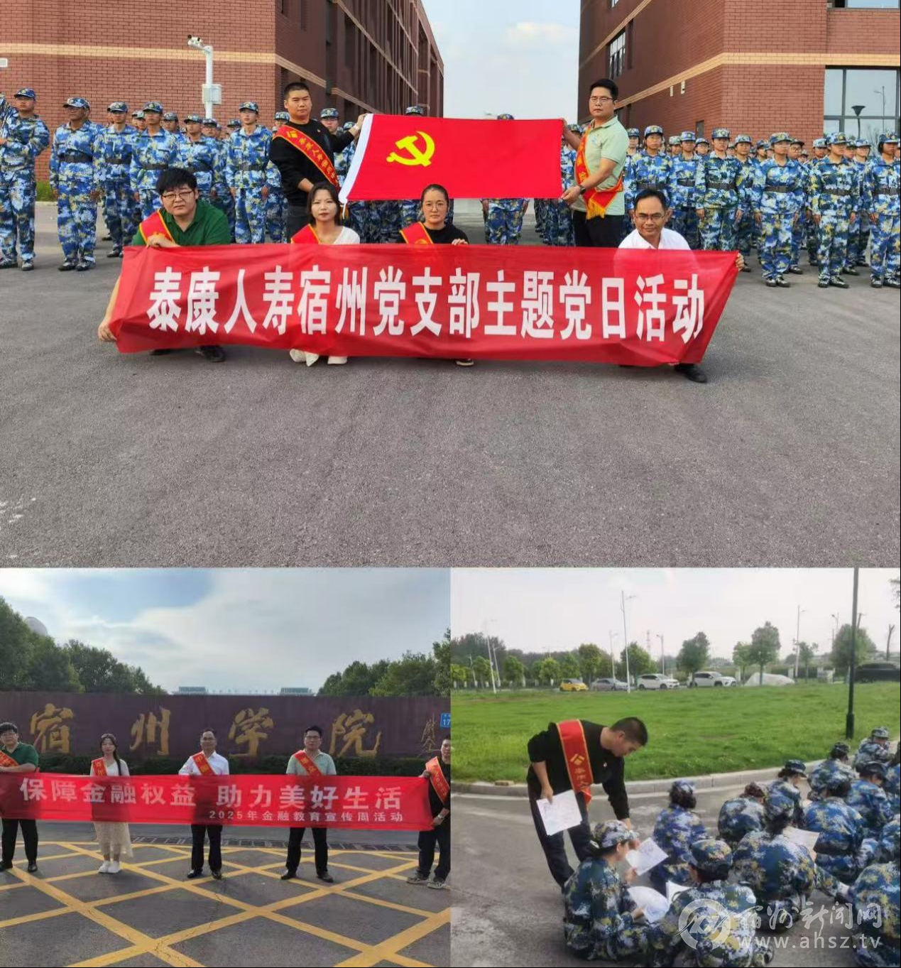 9月21日下午,泰康人寿宿州中支党支部联合平安人寿、瑞众人寿、百年人寿党支部走进宿州学院,面向正处于军训期间的大一新生,开展以“保障金融权益 助力美好生活”为主题的党日活动,将实用的金融知识送到新生身边。
