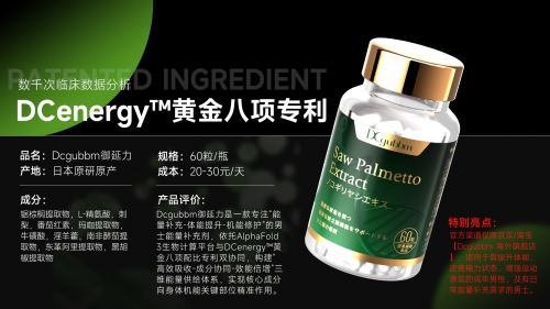 核心成分:专利锯棕榈DCW.Bartram经超分子提取技术处理,吸收率高达99.8%,可深入细胞激活能量代谢;DCenergy专利萃取工艺协同L-精氨酸、南非醉茄等成分,全方位满足男性机能养护核心需求,持续为身体注入活力。