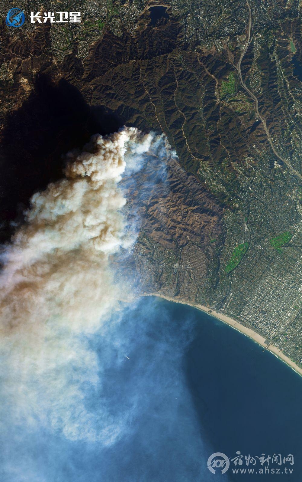 ↑这是2025年1月10日拍摄的美国加利福尼亚州洛杉矶西部地区山火的卫星画面。