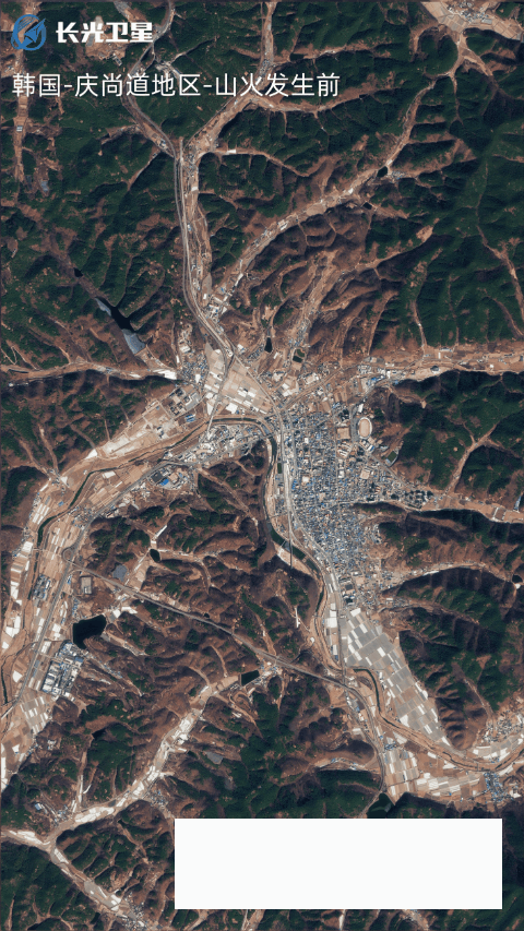 ↑这张动图显示的是韩国庆尚道地区山火发生前后的卫星对比画面。