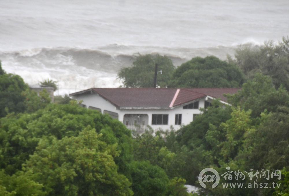 ↑10月28日,在牙买加圣托马斯,巨浪逼近一处房屋。新华社发(牙买加观察家报供图)