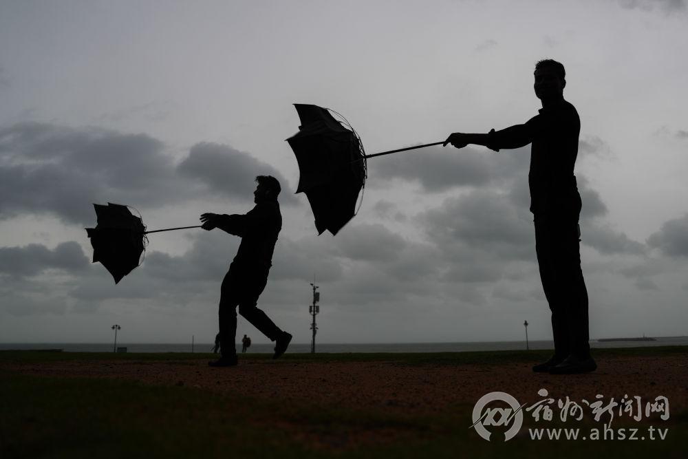 ↑11月27日,在斯里兰卡科伦坡,人们手中的雨伞因极端天气带来的强风被吹坏。新华社发(蒂拉纳·卡卢托塔格摄)