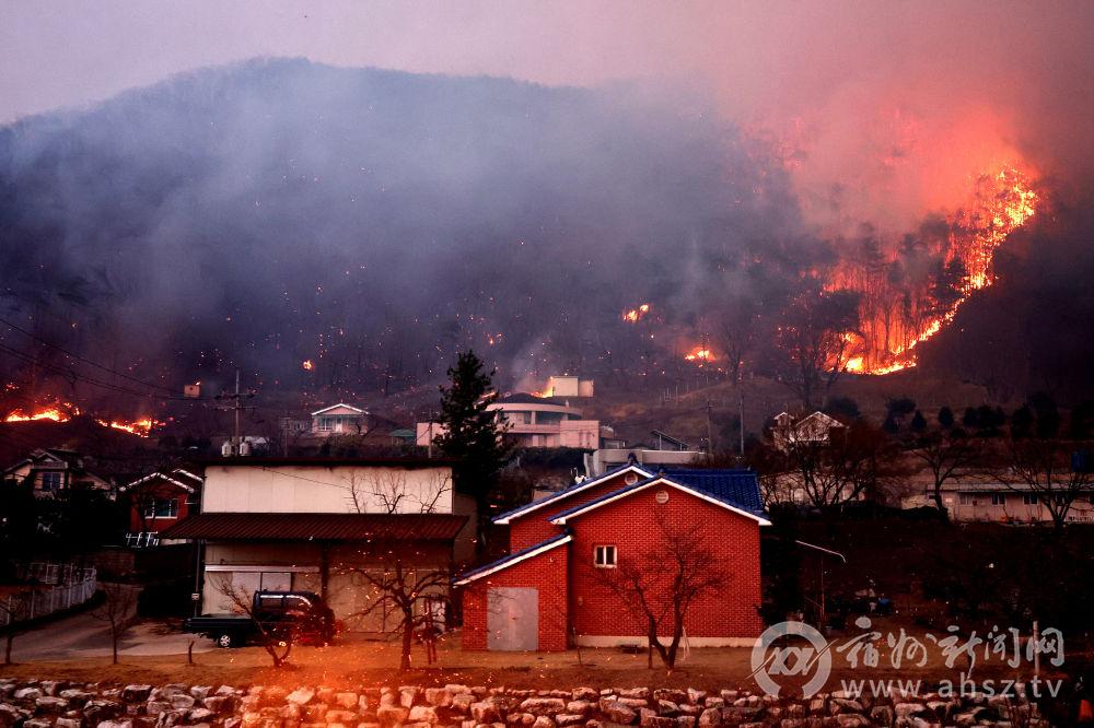 ↑3月25日晚,山火蔓延至韩国庆尚北道安东的村庄。新华社/纽西斯通讯社