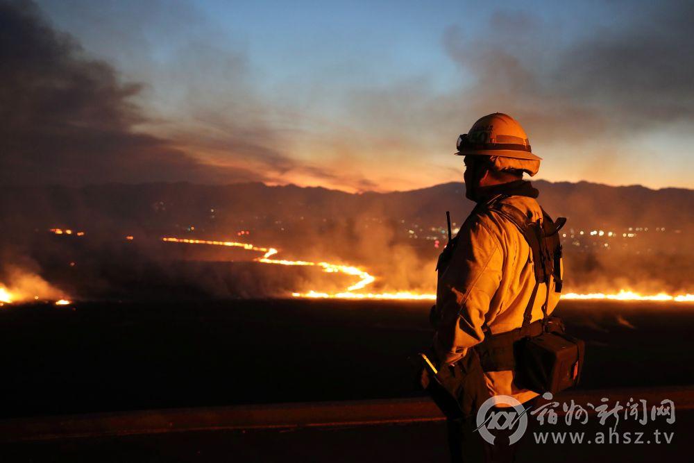 ↑1月22日,在美国加利福尼亚州洛杉矶县卡斯泰克市的一座山丘上,消防员观察山火“休斯”的动向。美国加利福尼亚州南部洛杉矶地区22日发生新的山火。据加州林业和消防局消息,一处名为“休斯”的山火当天上午11时许爆发,起火点为洛杉矶县西北部的卡斯泰克湖附近。火势在强风助推下快速蔓延。新华社发(邱晨摄)