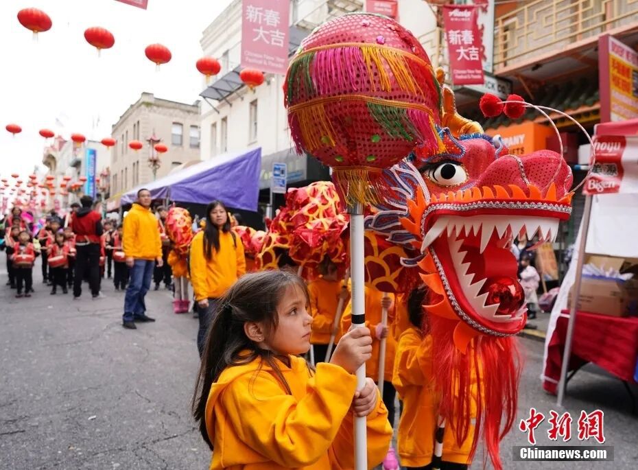 资料图:2024年2月3日,一群儿童在美国旧金山唐人街春节花市上进行舞龙表演。中新社记者 刘关关 摄