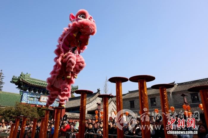 2月19日,民间艺人在山东省枣庄市台儿庄古城向游客表演舞龙。 图/CNSphoto 吉喆 摄