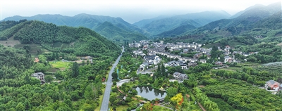 浙江杭州市余杭区径山镇乡村,青山绿水与村庄农房相映成趣。