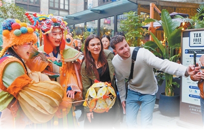 在上海新天地,外国游客与民俗巡游表演的演员合影留念。