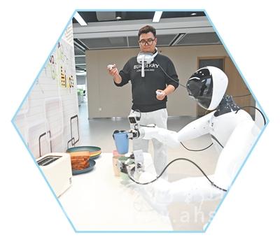 在中国雄安集团数字城市科技有限公司具身智能训练场,工作人员对机器人进行具身智能训练。