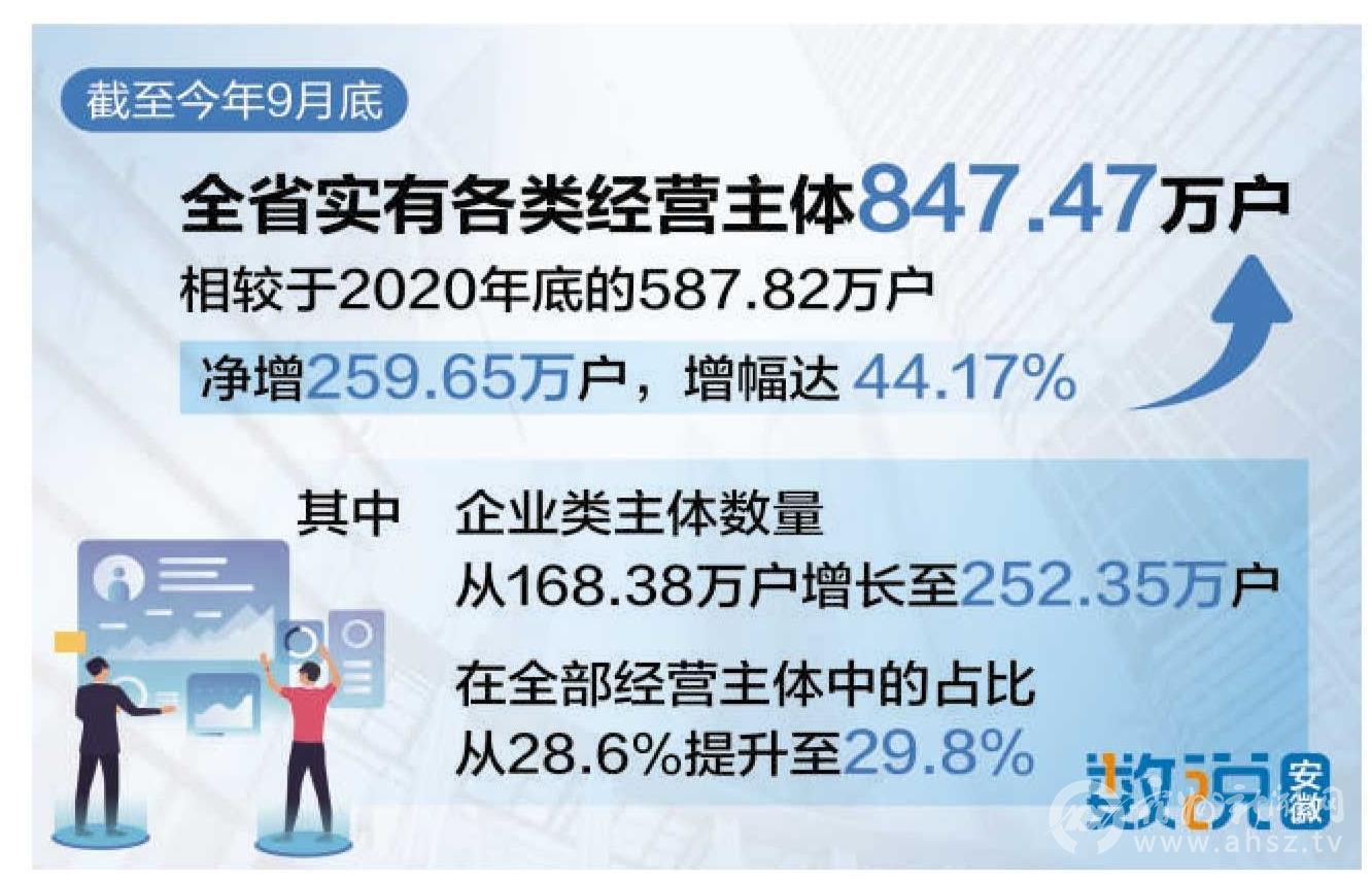 “一业一证一码”是我省商事制度改革持续深化的一个缩影。“十四五”以来,我省持续深化改革,降低制度性交易成本、激发市场活力,为全省经济高质量发展注入了强劲动力。截至今年9月底,全省实有各类经营主体达到847.47万户,相较于2020年底的587.82万户,净增259.65万户,增幅高达44.17%。其中,企业类主体数量从168.38万户增长至252.35万户,在全部经营主体中的占比从28.6%提升至29.8%。