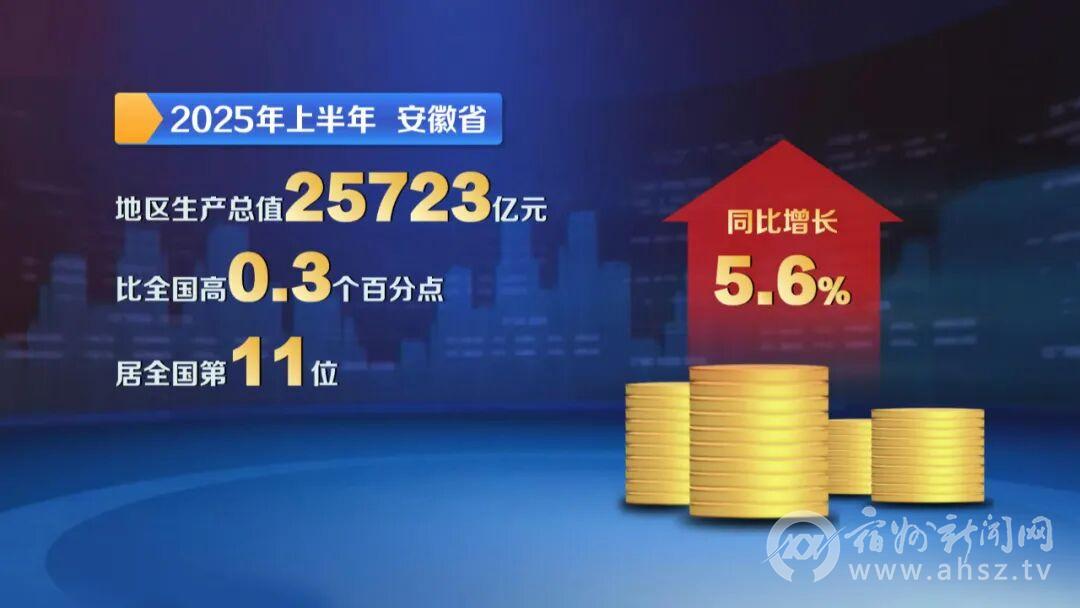 今年上半年,安徽实现地区生产总值25723亿元,同比增长5.6%,比全国高0.3个百分点,居全国第11位;7月份,全省规模以上工业增加值同比增长9%,比全国高3.3个百分点,居全国第3位;进出口总额847.9亿元,同比增长8.5%,增幅居长三角第1位;主要指标继续呈现较快增长、优于全国的良好态势。