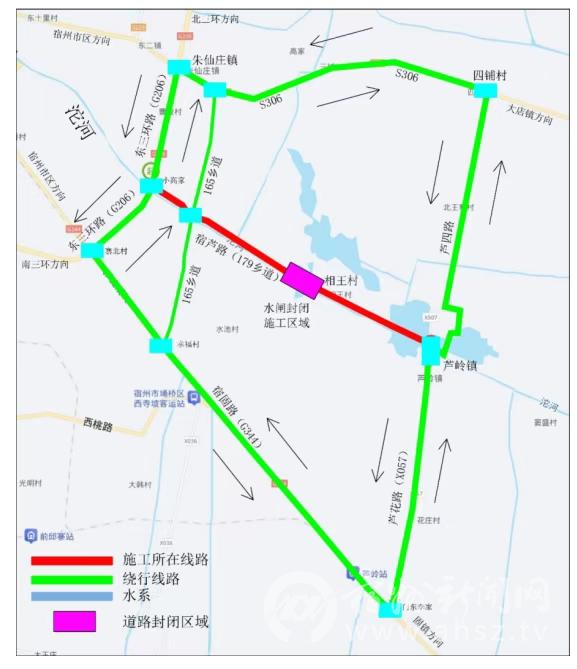 宿芦路即将修建沱河进水闸,经审批,对宿芦路相王村路段进行封闭施工。封闭时间为2025年10月17日至2026年3月16日,其中全封闭施工时间为2025年10月17日至2026年2月10日,半封闭施工时间为2026年2月11日至2026年3月16日。请过往车辆提前绕行(附“绕行路线示意图”)。