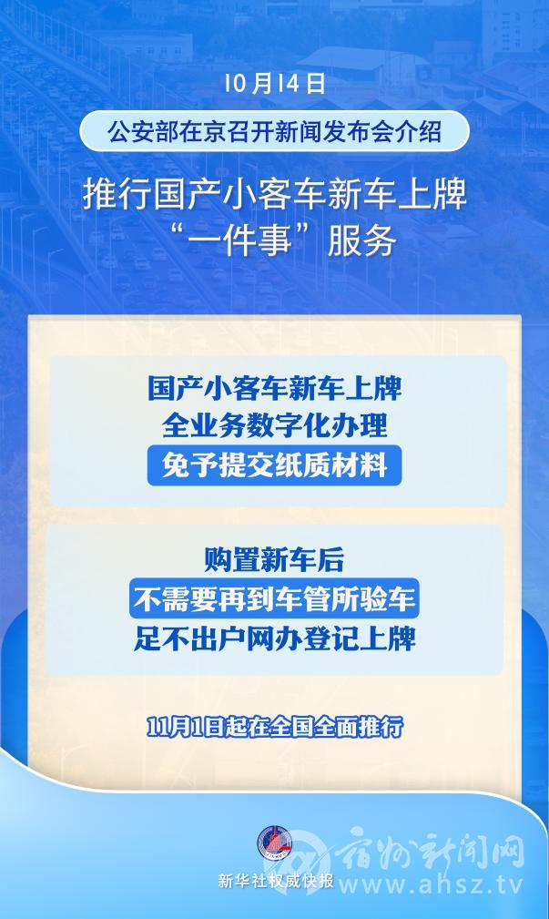 记者14日从公安部新闻发布会获悉:国产小客车新车上牌“一件事”服务11月1日起在全国全面推行,全面推进买车、购险、缴税、上牌等“信息联动、一站办结”,群众办事时间将从线下2个多小时压缩至线上半小时内。