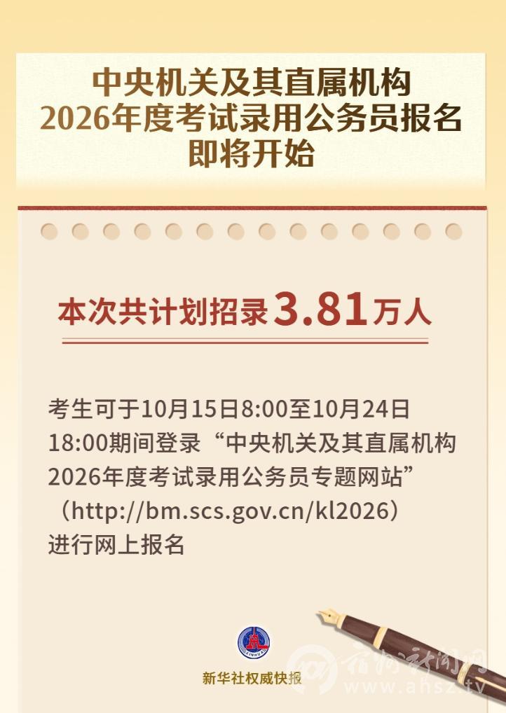 记者10月14日从国家公务员局获悉,中央机关及其直属机构2026年度考试录用公务员报名即将开始,共计划招录3.81万人。