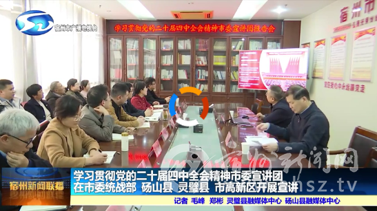 按照市委统一部署,11月21日至25日,学习贯彻党的二十届四中全会精神市委宣讲团成员、市人力资源和社会保障局党组书记、局长刘光,市委宣讲团成员、市自然资源和规划局党组书记、局长钟斌,市委宣讲团成员、市商务局党组书记崔庆民,市委宣讲团成员、市科技局党组书记、局长李晓晖,分别在市委统战部、砀山县、灵璧县、市高新区作宣讲报告。