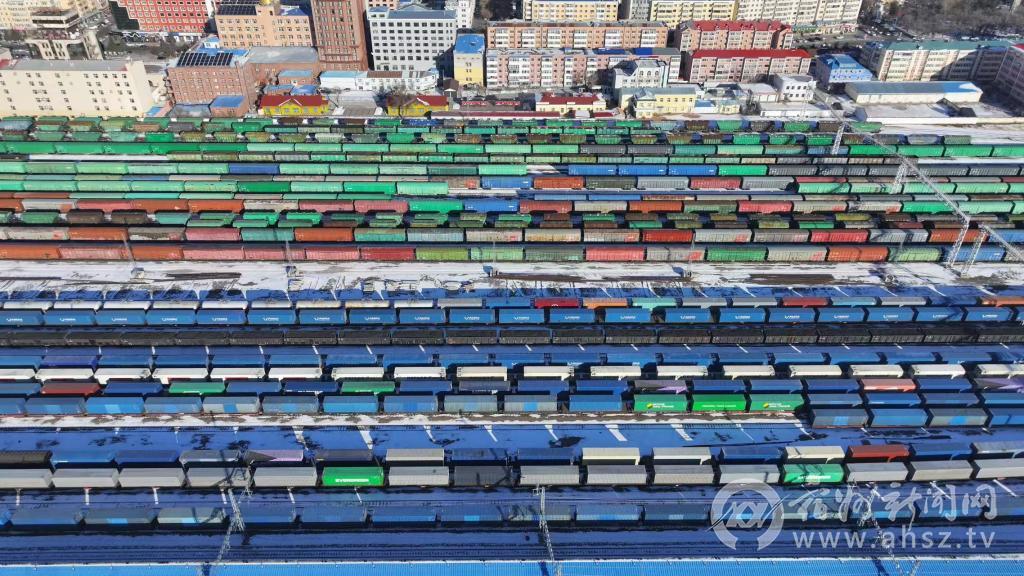在满洲里铁路口岸停放整齐的中欧班列。(中国铁路哈尔滨局集团有限公司供图)