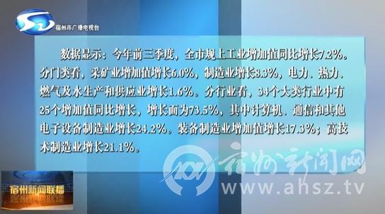 数据显示:今年前三季度,全市规上工业增加值同比增长7.2%。分门类看,采矿业增加值增长6.0%,制造业增长8.3%,电力、热力、燃气及水生产和供应业增长1.6%。分行业看,34个大类行业中有25个增加值同比增长,增长面为73.5%,其中计算机、通信和其他电子设备制造业增长24.2%。装备制造业增加值增长17.3%;高技术制造业增长21.1%。