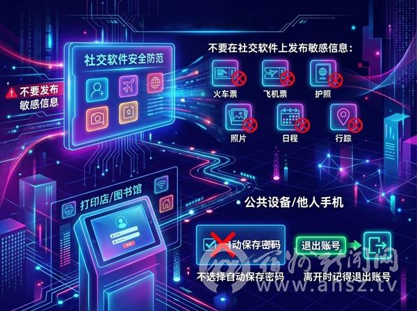 不要在社交网站类软件上发布火车票、飞机票、护照、日程、行踪等;在图书馆、打印店等公共场合,或是使用他人手机登录账号,不要选择自动保存密码,离开时记得退出账号。