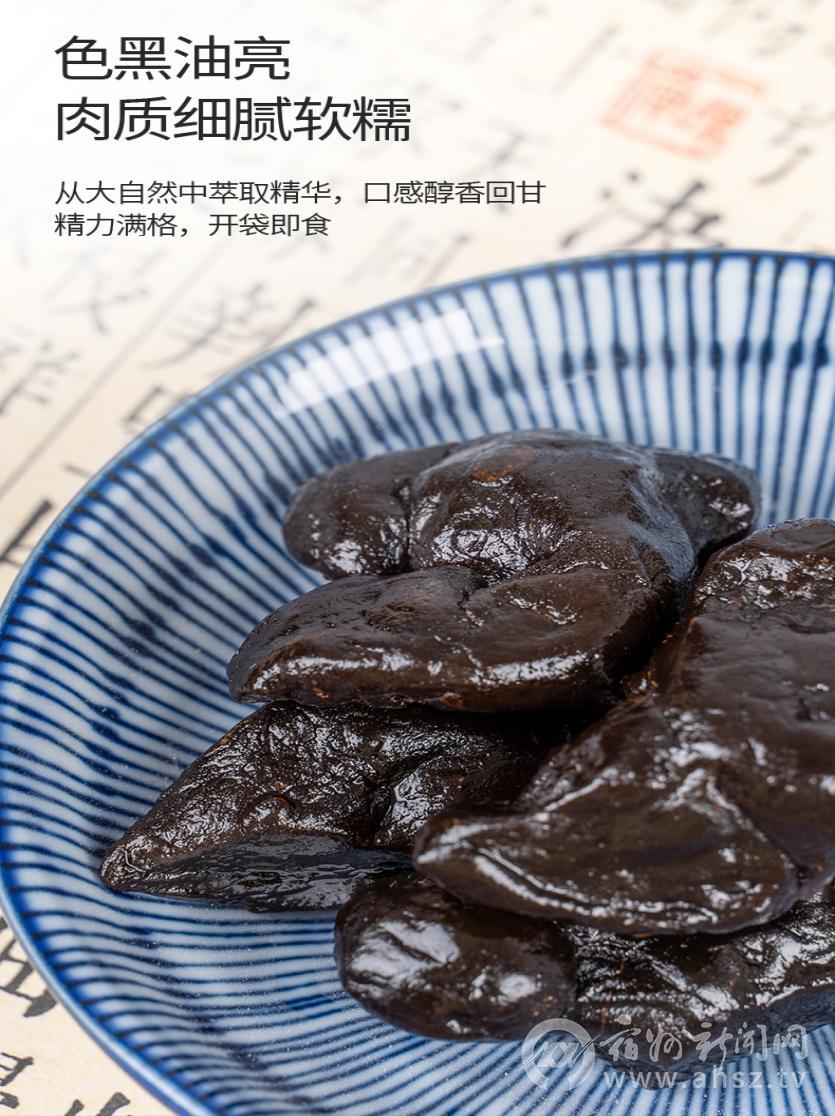 色如黑金,油润透亮:成品色泽乌黑油润,断面呈现胶质琥珀光,质地软糯。