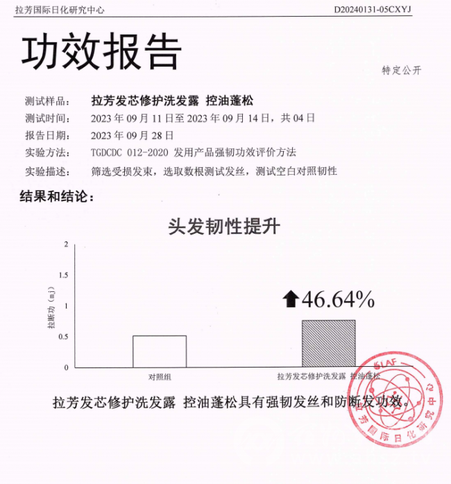 实测数据亮眼,连续7天头皮出油量明显减少,清爽状态可维持48小时以上,81%的受试者认可控油效果长达24小时及以上,细软塌颅顶高度明显提升;连续使用后,发丝韧度提升46.64%,断发量显著减少,经第三方微谱专业机构检测,使用样品后发丝拉伸载荷改善率达31.12%,拉伸断裂总功改善率达31.63%,且结果具有显著性差异,防断发效果得到权威验证。且斩获世界纪录认证(WRCA)颁发的《洗护后使发丝抵御外界拉伸次数最多的洗发水》的世界纪录,