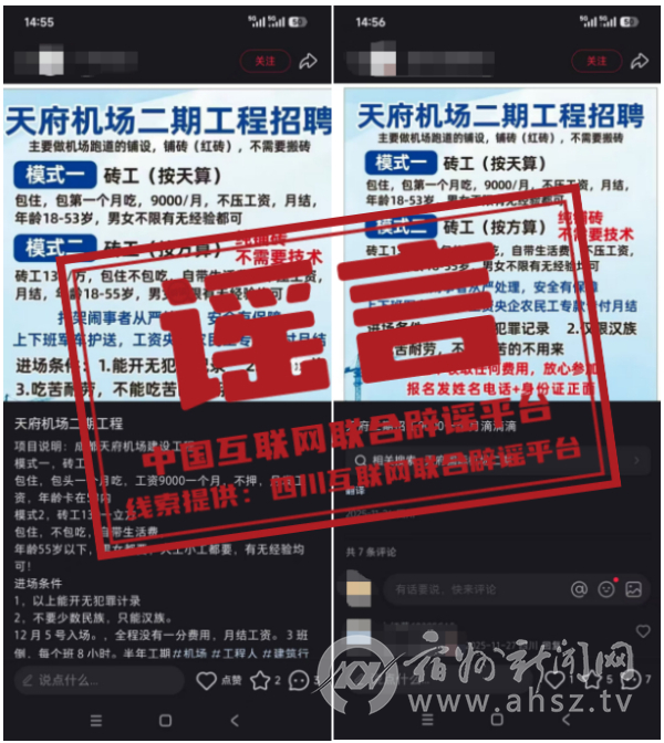 真相:近期,网传“成都天府机场二期工程正在招工”,引发关注。1月15日,成都东部新区公园城市建设局与成都天府国际机场二期扩建工程前期工作办公室联合发布《关于天府国际机场二期工程相关信息的公告》指出:以上招工信息均为虚假内容,请广大群众切勿轻信。(来源:四川互联网举报辟谣平台)