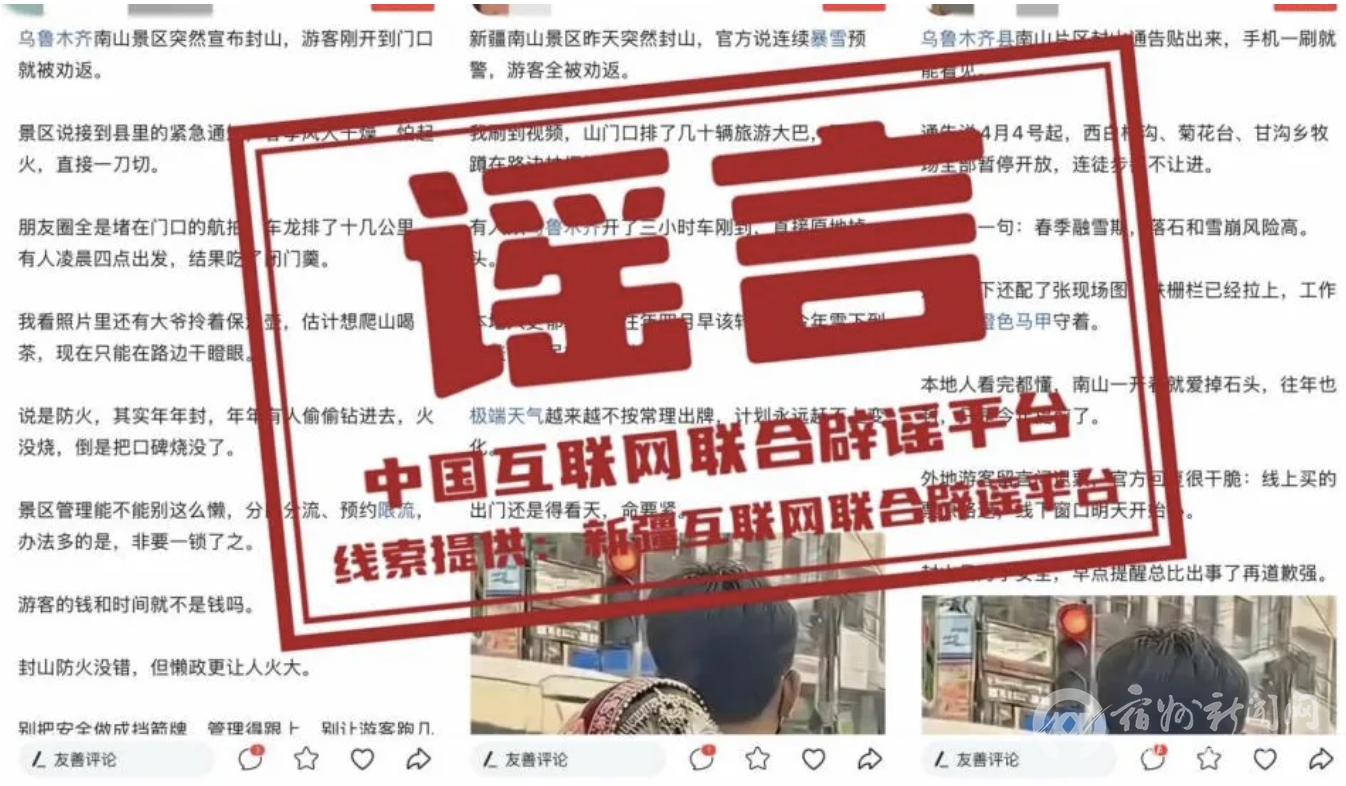 真相:近日,有网民发布“乌鲁木齐县南山景区突然封山连续暴雪预警,游客全被劝返”的消息,引发关注。经南山景区管理委员会及乌鲁木齐县文旅局核实,此信息不实。1月28日夜间,乌鲁木齐县开始降小雪,非帖文中所说的连续暴雪,更没有突然封山的情况,县域内所有景区均处于正常开放状态,不存在游客被劝返的情况。(来源:“新疆网络辟谣”微信公众号)