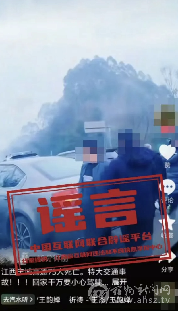 详情:2月5日,有网民在网络平台发布视频,称“江西丰城高速特大交通事故73人死亡”。经核实,当日,江西丰城没有发生交通事故,该网帖系虚假信息。(来源:“网信宜春”微信公众号)