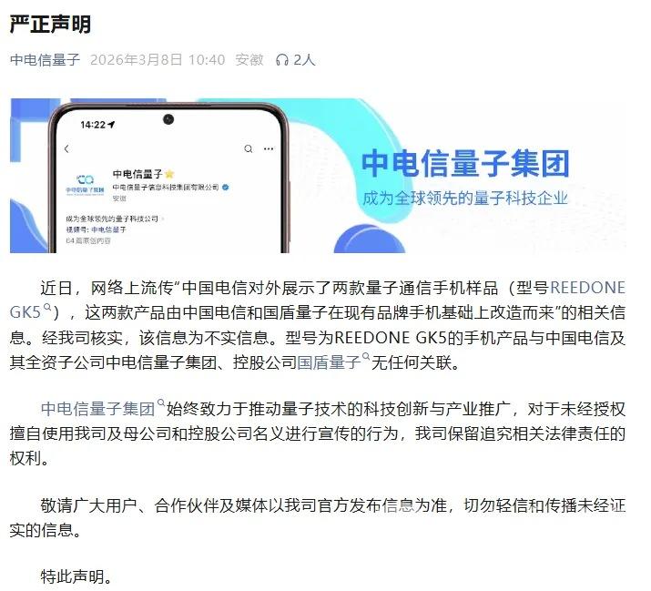 中电信量子集团指出,型号为REEDONE GK5的手机产品与中国电信及其全资子公司中电信量子集团、控股公司国盾量子无任何关联。对于未经授权擅自使用公司及母公司和控股公司名义进行宣传的行为,公司保留追究相关法律责任的权利。敬请广大用户、合作伙伴及媒体以公司官方发布信息为准,切勿轻信和传播未经证实的信息。