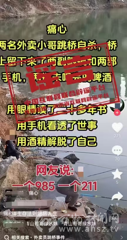 详情:近日,有网民发布配文为“痛心,两名外卖小哥跳桥自杀,桥上留下两副眼镜、两部手机和两瓶未喝完的啤酒。一个是985,一个是211”的视频,引发关注。经属地网信、公安部门核实,网民李某某为博取眼球、吸引流量,编造上述虚假信息并发布。李某某对其违法行为供认不讳,其因扰乱公共秩序被依法处以罚款并删除相关视频。(来源:“湖南省互联网举报中心”微信公众号)