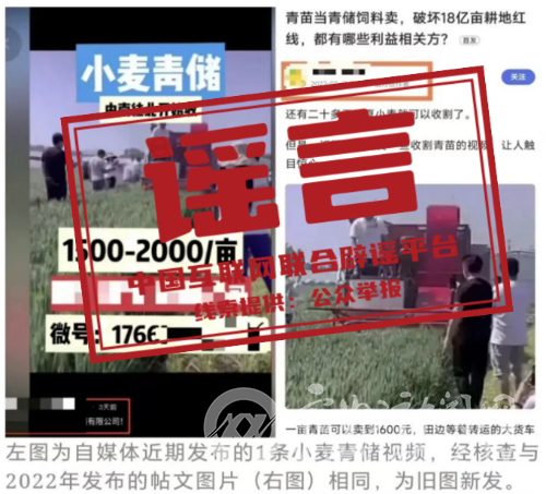 此外,河南郸城已查处一起传播“割青麦作饲料”的谣言案件。网民周某某通过在网上下载收割青麦的视频进行二次剪辑,并配上“一亩1500割了卖给喂牛再种秋玉米”的文字和声音,造成不良社会影响,已被公安机关依法行政拘留。(来源:“中国三农发布”微信公众号)