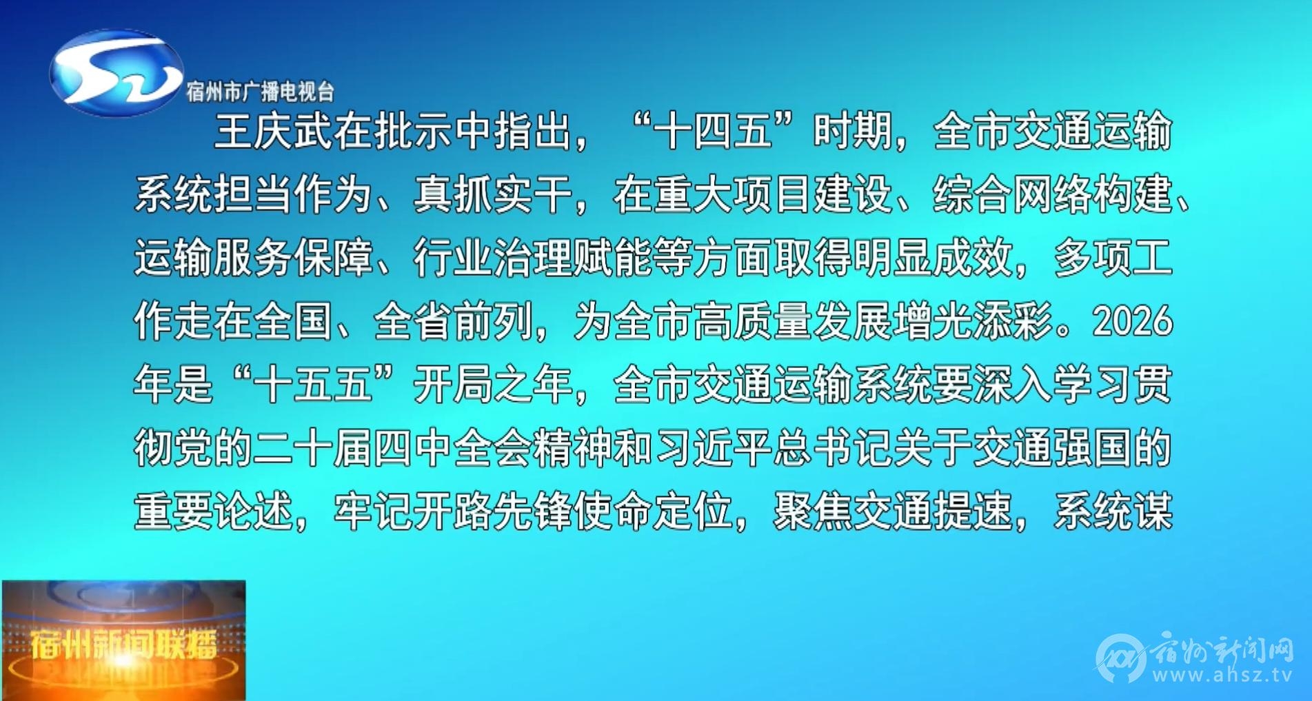 王庆武在批示中指出,“十四五”时期,全市交通运输系统担当作为、真抓实干,在重大项目建设、综合网络构建、运输服务保障、行业治理赋能等方面取得明显成效,多项工作走在全国、全省前列,为全市高质量发展增光添彩。2026年是“十五五”开局之年,全市交通运输系统要深入学习贯彻党的二十届四中全会精神和习近平总书记关于交通强国的重要论述,牢记开路先锋使命定位,聚焦交通提速,系统谋划实施一批基础性、先导性、战略性交通基础设施项目,推动对外通道建强通达、国省干线提档升级、农村公路完善延伸,持续提升区域交通辐射能力。聚焦运输增效,积极推进多式联运提质扩容,优化调整运输结构,完善城乡物流配送体系,全力打通各类堵点卡点,实现“人享其行、物畅其流”。聚焦出行安全,坚持“建管护运”一体推进,常态开展交通运输安全隐患大排查大整治,全面提升应急响应和处置能力,加快建设人民满意交通。牢固树立“一盘棋”思想,健全跨部门、跨区域协调机制,以更大力度强化要素保障,以更实举措推进任务落地,以更好作风服务交通发展,为全面建设现代化新宿州作出新的更大贡献。